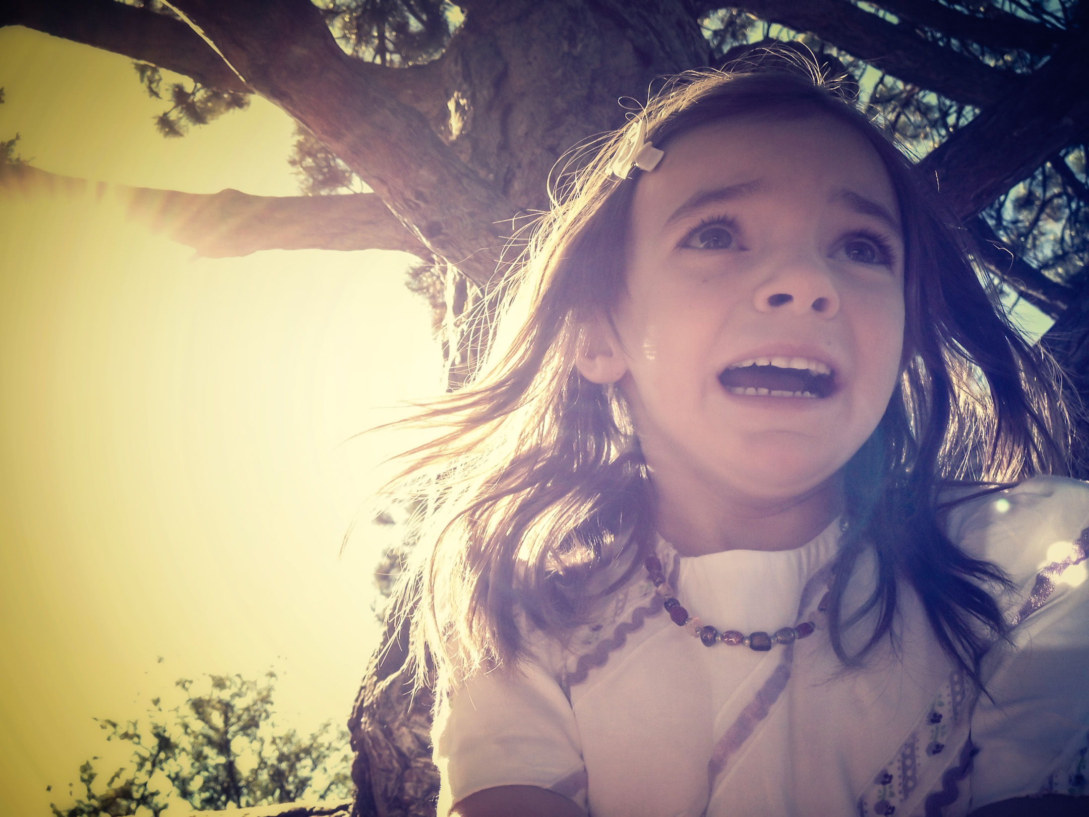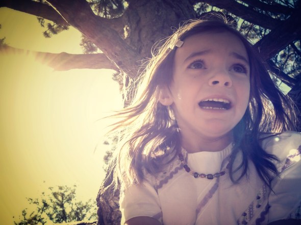So, we’re wrapping up our adventure at Denver’s Museum of Nature and Science, when the kids decided to climb the parking lot trees right before loading up. Naturally, Molly got a few branches up and got scared (no worries, this is normal and she loves it) and as usual, I took out the old iPhone to grab a shot. How the photo ended up looking like a 70s horror film is beyond me, she likes the shot all the same though.